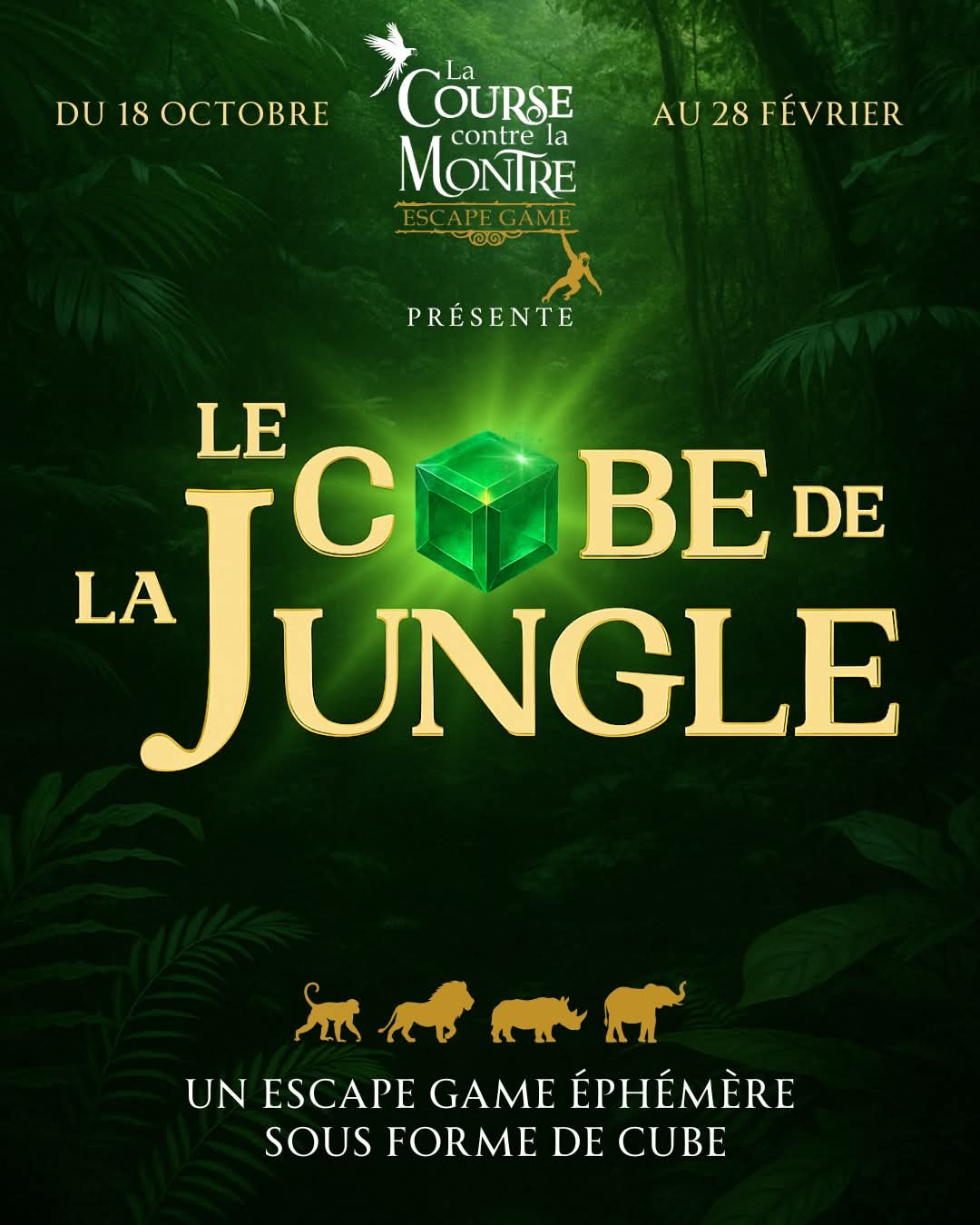 Du 18 octobre 2025 au 28 février 2026, La Course contre la Montre vous ouvre les portes du Cube de la Jungle, une mission inédite qui vous plonge au cœur d’un univers fascinant. Durant 70 minutes, aventurez-vous dans les profondeurs d’une sombre forêt tropicale et résolvez les énigmes de ce mystérieux cube… Afin de percer tous ses secrets, vous et votre équipe (composée de 2 à 5 aventuriers ou aventurières) devrez faire preuve de réflexion, d’observervation, de manipulation et de communication. Alors, êtes-vous prêts à vous embarquer dans ce voyage au coeur de la jungle ?
